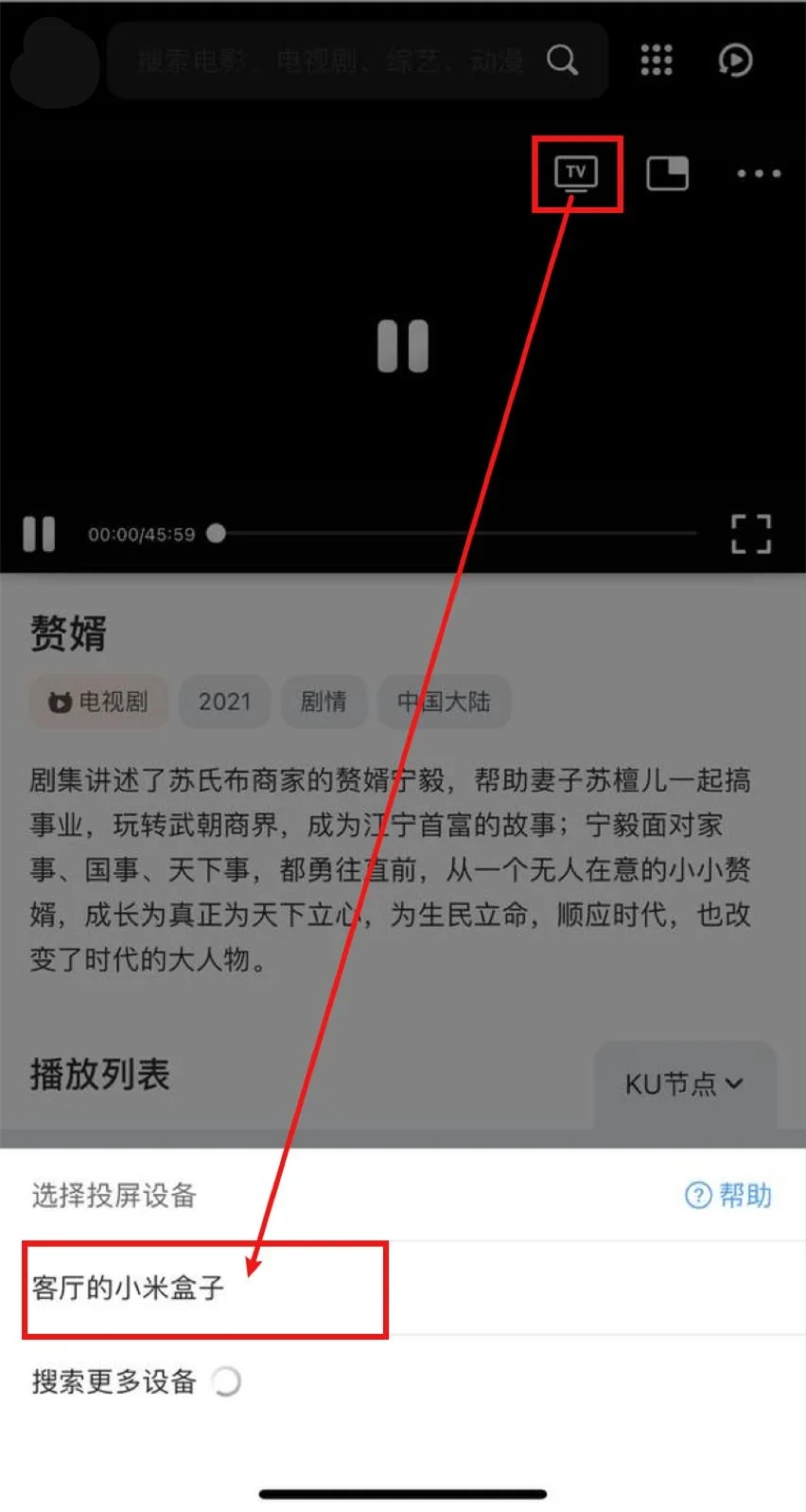 打开QQ浏览器(会接管网页播放器)->打开免费短视频分享大全 - 婷好影视->播放视频->选中投屏图标->等待搜寻出智能电视/电视盒子->选中,即可投屏。